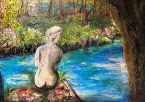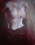 Deze schilderijen van naakte vrouwen (en mannen) in diverse poses, zijn gemaakt met weinig teinten. Ik houd van de kleur rood hierbij en vind het leuk in deze schilderijen te experimenteren met structuur en laksoorten. De doeken vormen een bron van inspiratie omdat zij transparant of met structuur zijn aangebracht gedrapeerd over het lichaam.